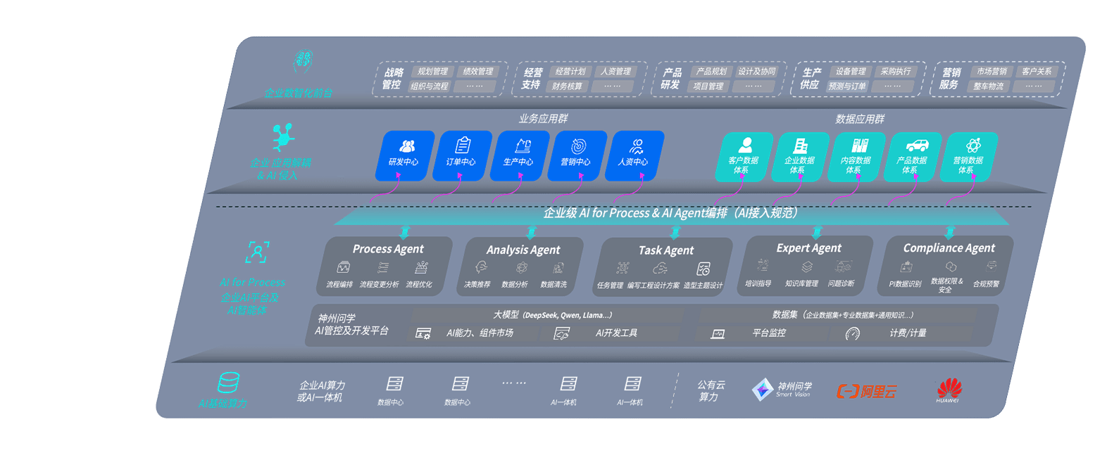 端到端的一站式AI工作空间深度融合了从企业战略规划到日常经营的全流程业务板块,,定向解决车企内部领域多、、、、部门多、、、链条长、、、、场景碎片化等难题,,支持车企快速构建以AI为核心的生产力写作体系,,,实现任务执行与AI能力的无缝集成与交互